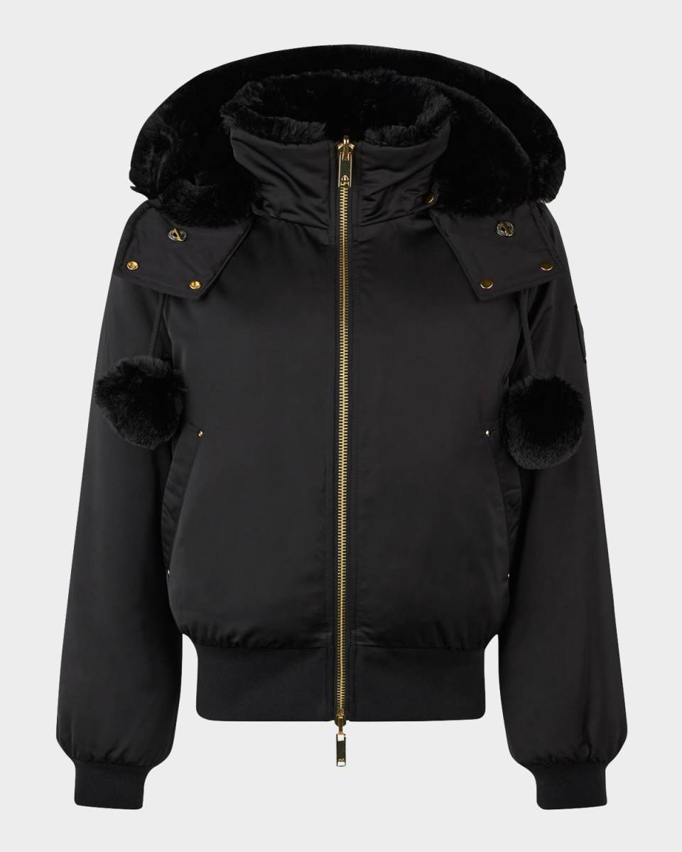 Moose Knuckles "Debbie" reversible bomber jacket featuring a snapoff hood, drawstring pompoms, and fauxfur (polyester) lining One side is waterproof, windbreaker Stand collar Long sleeves with ribknit cuffs; approx. 33.5"L Metal logo patch at left sleeve Side slip pockets Classic fit Ribknit hem sits at the hip Twoway zip front Nylon/polyamide/faux fur Lining: Polyester Dry clean or machine wash cold inside out Imported