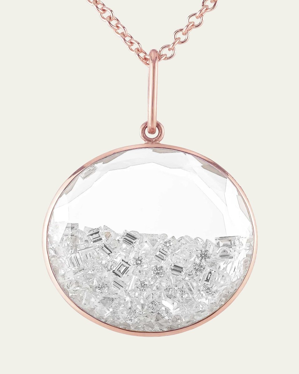 Moritz Glik pendant necklace Kaleidoscope Shaker™ rings and bracelets are waterresistant, but we do recommend them to be kept away from water as much as possible. Necklaces and earrings are not waterresistant. Keep them away from water and other liquids at all times. Do not shower or swim with your jewels. Use a soft dry cloth to remove fingerprints and dust from the crystal panes when necessary. Do not machine polish or apply fire. Do not use ultrasonic or steam cleaners. If any maintenance or repair is needed, please contact us at info@moritzglik.com 18karat rose gold Round white sapphire kaleidoscope pendant Freefloating diamonds set in shaker Total diamond carat weight: 2.6 Adjustable length Lobster clasp Made in the USA