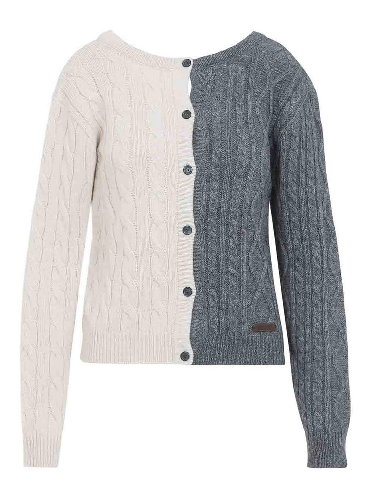 Cardigan gris bicolore Moschino confectionné en rose et gris et mélange en maille torsadée, bouton sur le devant et dans le dos, encolure arrondie, encolure en V, encolure au dos, étiquettes de marque, manches longues, bords côtelés