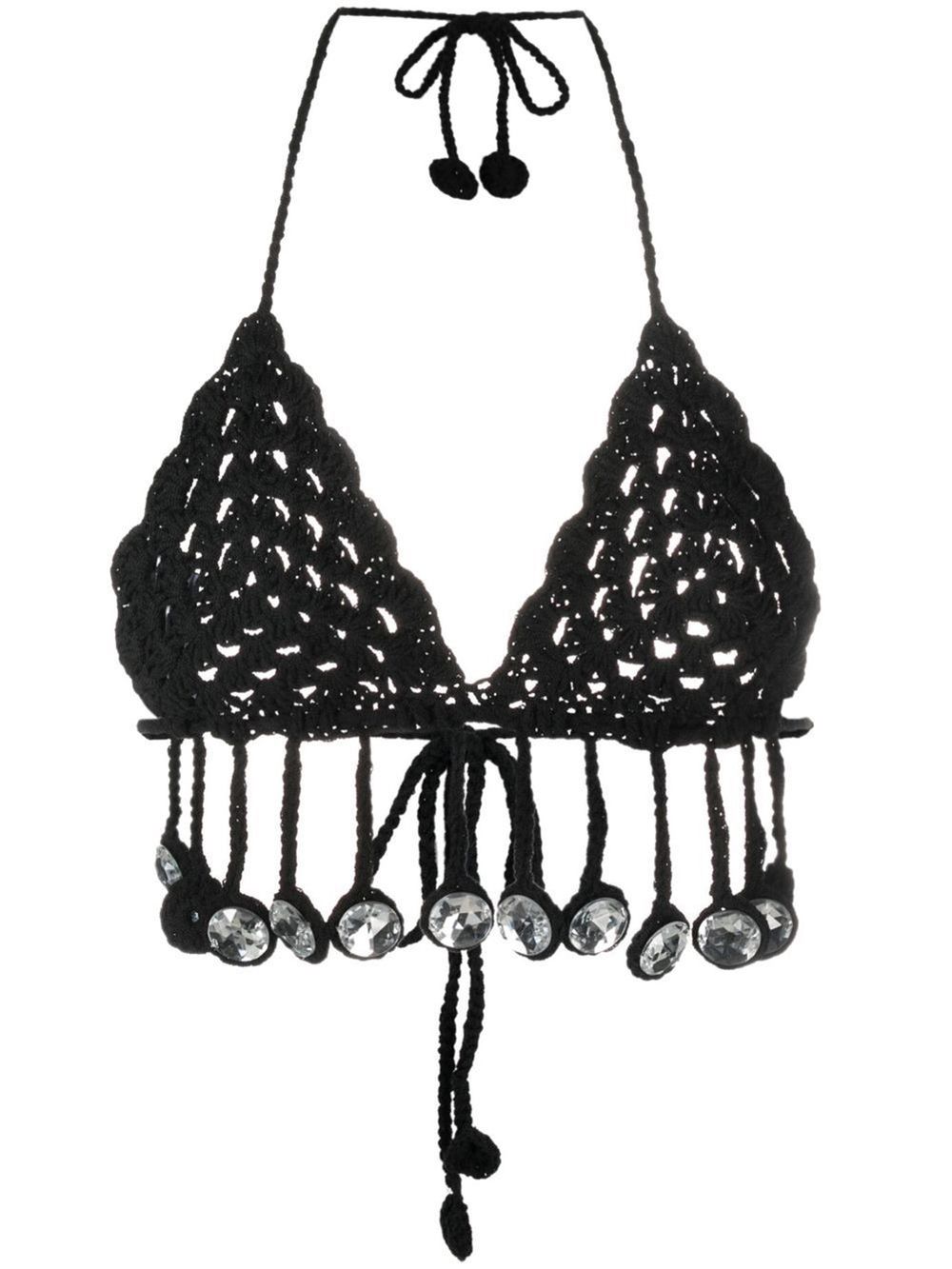 black cotton blend crystal embellishment crochet knit halterneck tie fastening fringe detailing Be mindful to try on swimwear over your own garments.