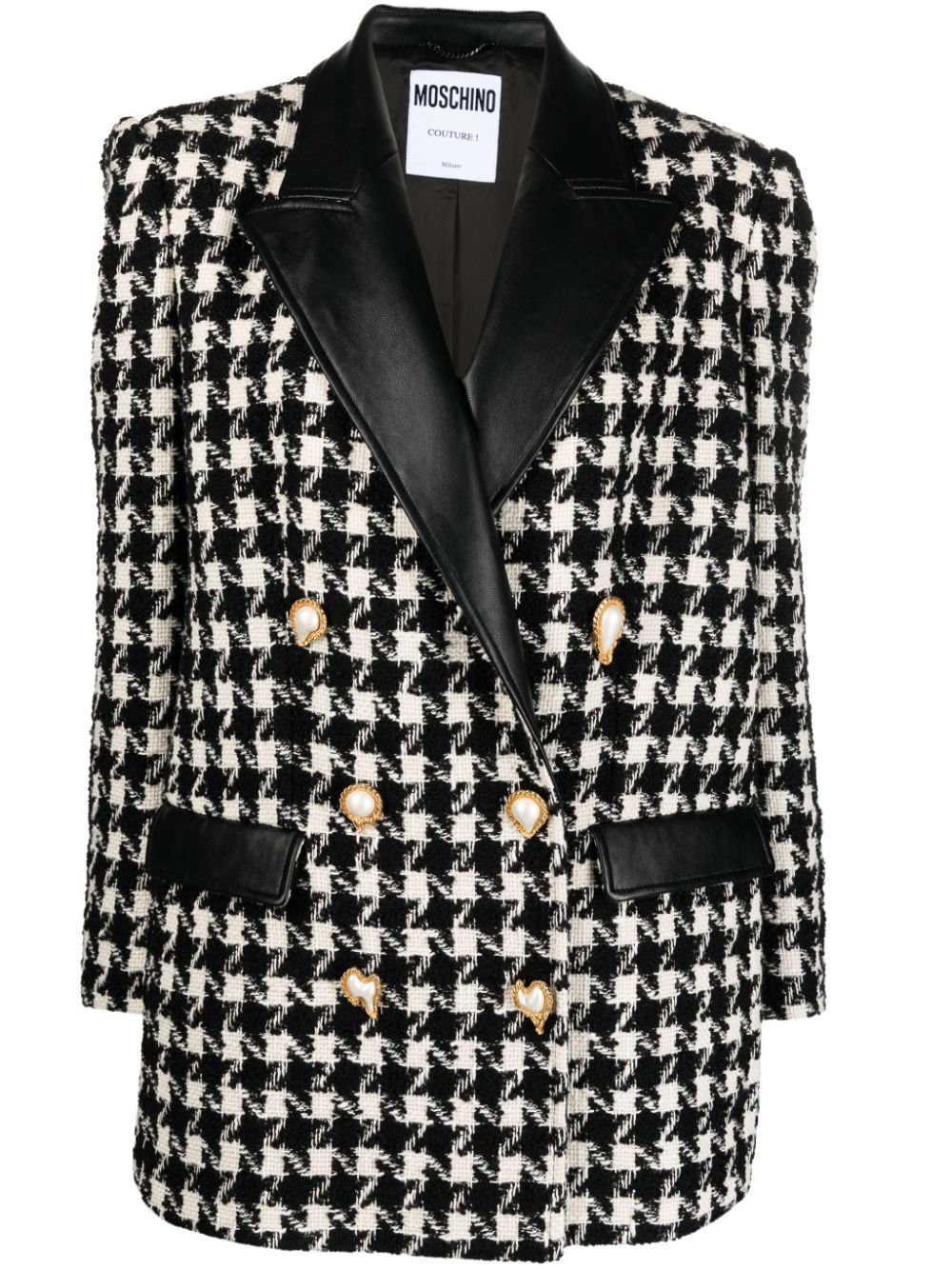 black/white virgin wool blend houndstooth pattern contrasting trim peak lapels double-breasted button fastening embossed gold-tone buttons long sleeves straight hem