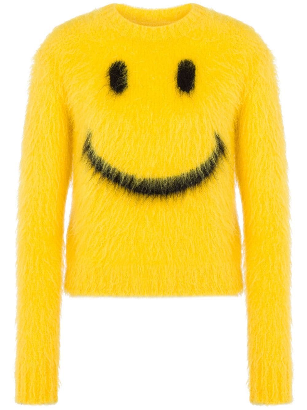 banana yellow wool blend brushed effect intarsia knit smiley face motif intarsia-knit logo