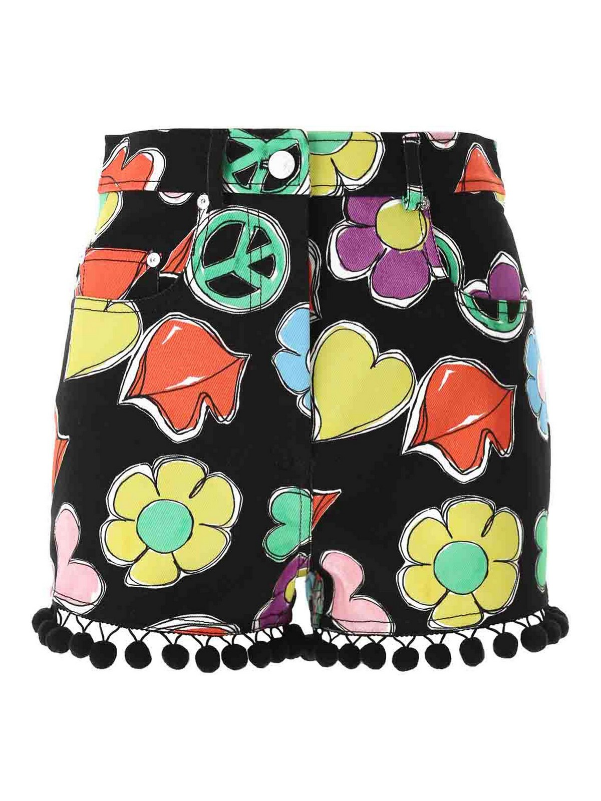 short à symboles en coton stretch multicolore, short en taureau stretch caractérisé par l'imprimé de symboles moschino sur toute la surface, jeans multicolores et mini-pompons noirs appliqués sur le bas, ouverture sur le devant avec logo, bouton et fermeture éclair, passants de ceinture à la taille, poches avant, poches latérales et plaquées au dos, trois poches sur les deux poches plaquées au dos, boutons à clous logotés, rivets siglés, passants de ceinture à la taille, poches avant et poches latérales, poches latérales et plaquées à l'arrière, trois poches sur les deux poches plaquées au dos, boutons à clous logotés, rivets siglés, passants de ceinture à la taille, imprimé de symboles moschino appliqué sur la couleur multicolore inférieure