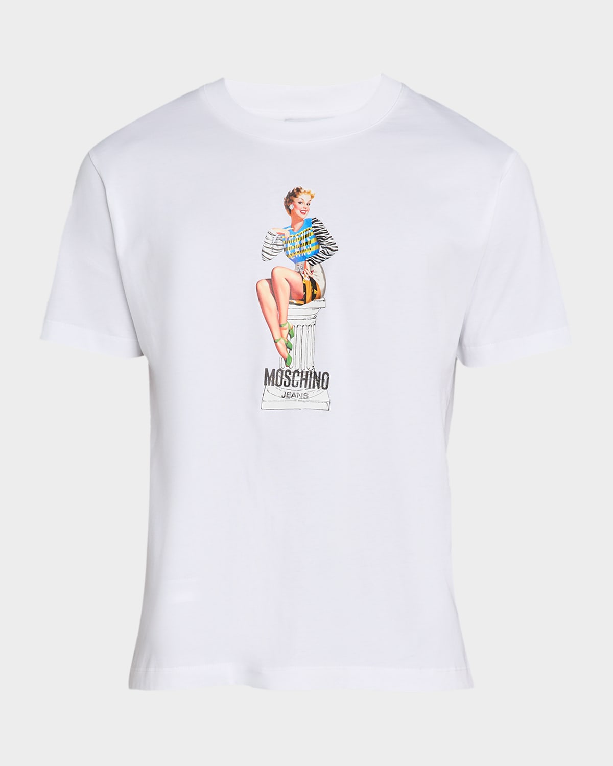 Moschino Jeans graphicprint cotton tee Crew neckline Short sleeves Classic fit Hem falls to the hip Pullover style Cotton Made in Portugal