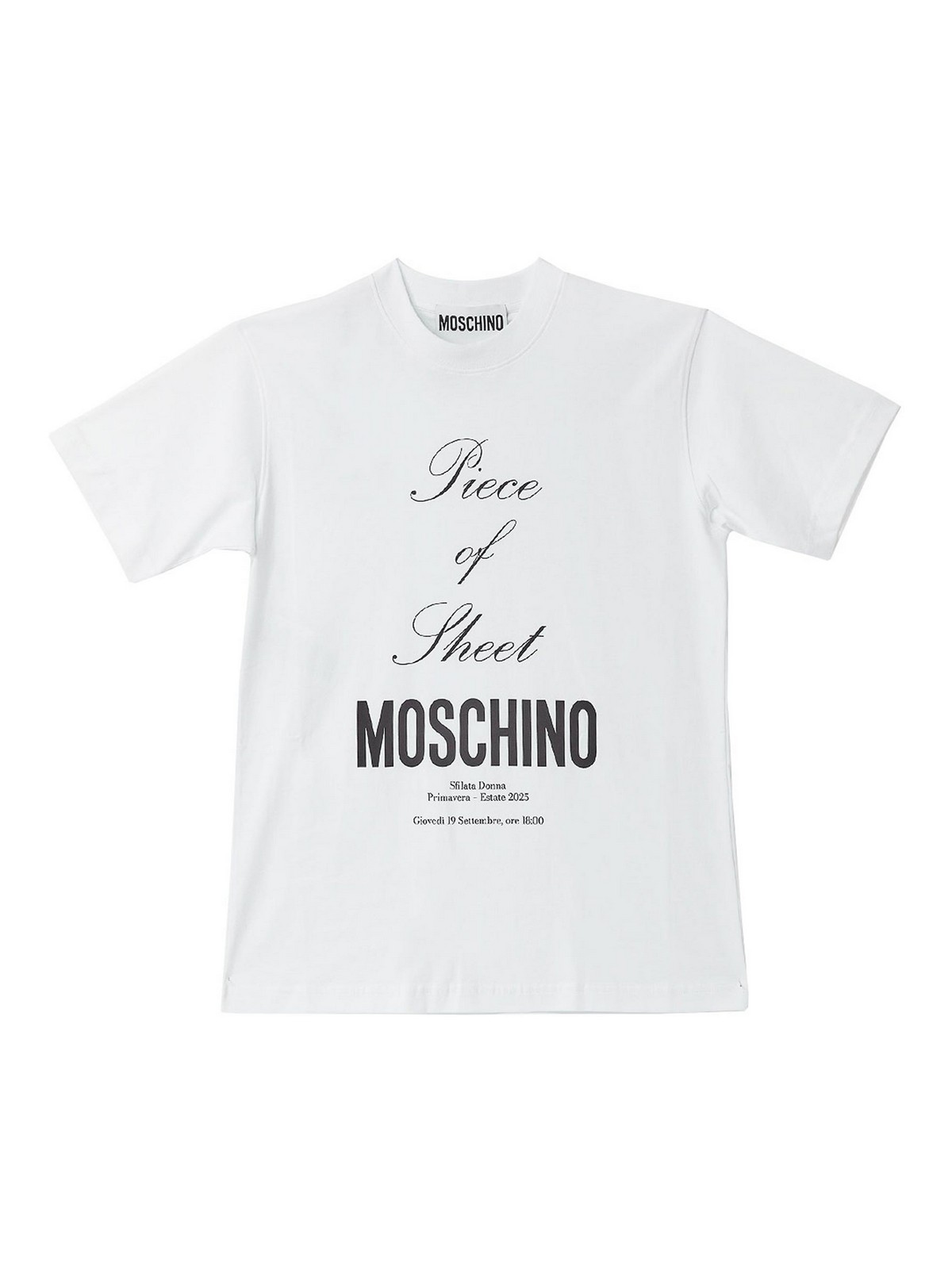 T-shirt en tissu à manches blanches avec col côtelé, caractérisé par l'impression du slogan sur le morceau de feuille et le logo Moschino avec date et lieu de la parade à manche court CROBROL CHRISTER FRONT BRUN ET BLANC