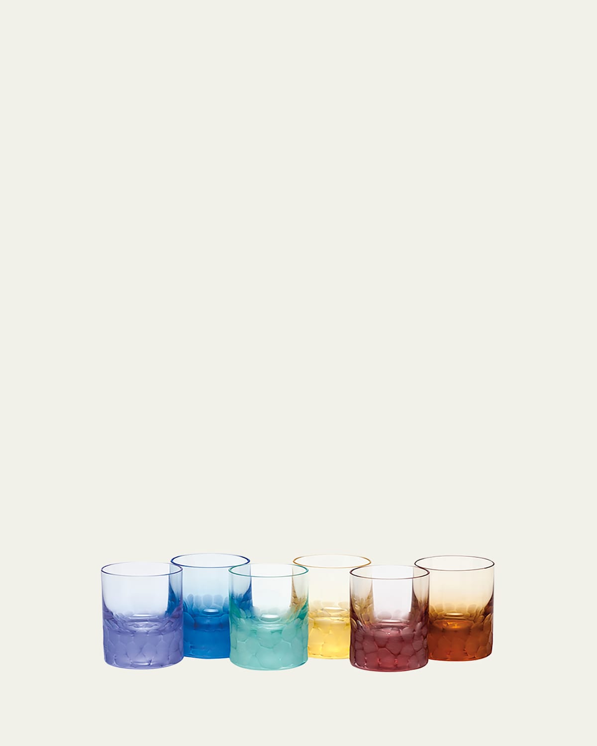Set of six multicolor crystal shot glasses. Each holds 2 fl. oz. Pebbled design. Hand wash. Made in the Czech Republic.