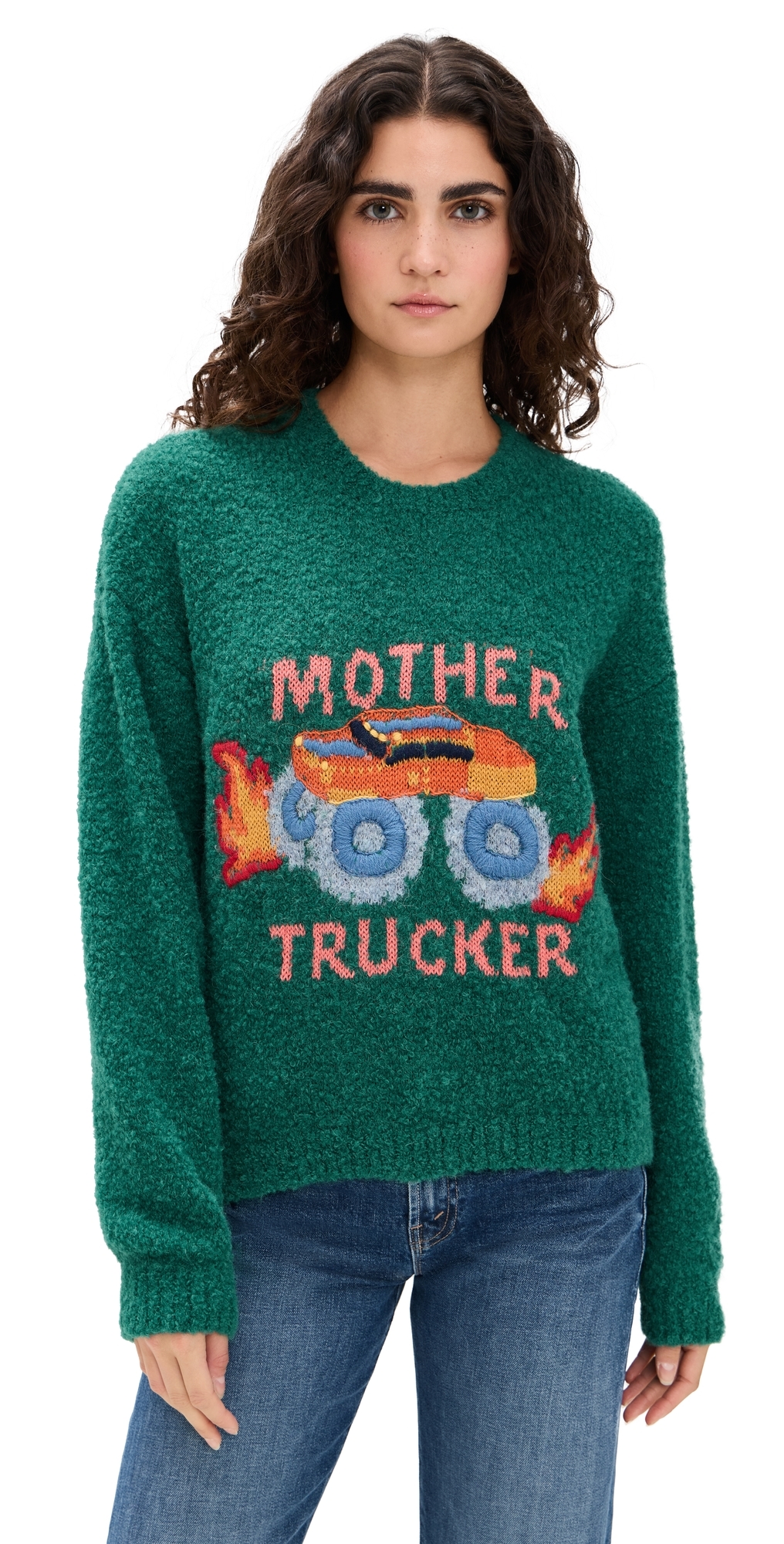 Fabric: Lightweight boucle knit with stretch. Intarsia knit lettering and embroidered monster truck at front. Crew neck. Long sleeves with dropped shoulders. Shell: 83% alpaca/10% polyamide/6% acrylic/1% wool. Dry clean. Imported, Peru. Measurements: Measurements from size S Length: 20.5in / 52.0cm, from shoulder