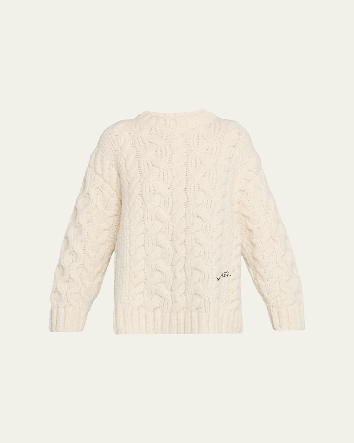 MOTHER "The Biggie" sweater crafted from a chunky cableknit alpaca blend Crew neckline Dropped shoulders Long sleeves Relaxed fit Hem falls to the hip Pullover style Fur/wool/polyester Dry clean Made in Peru