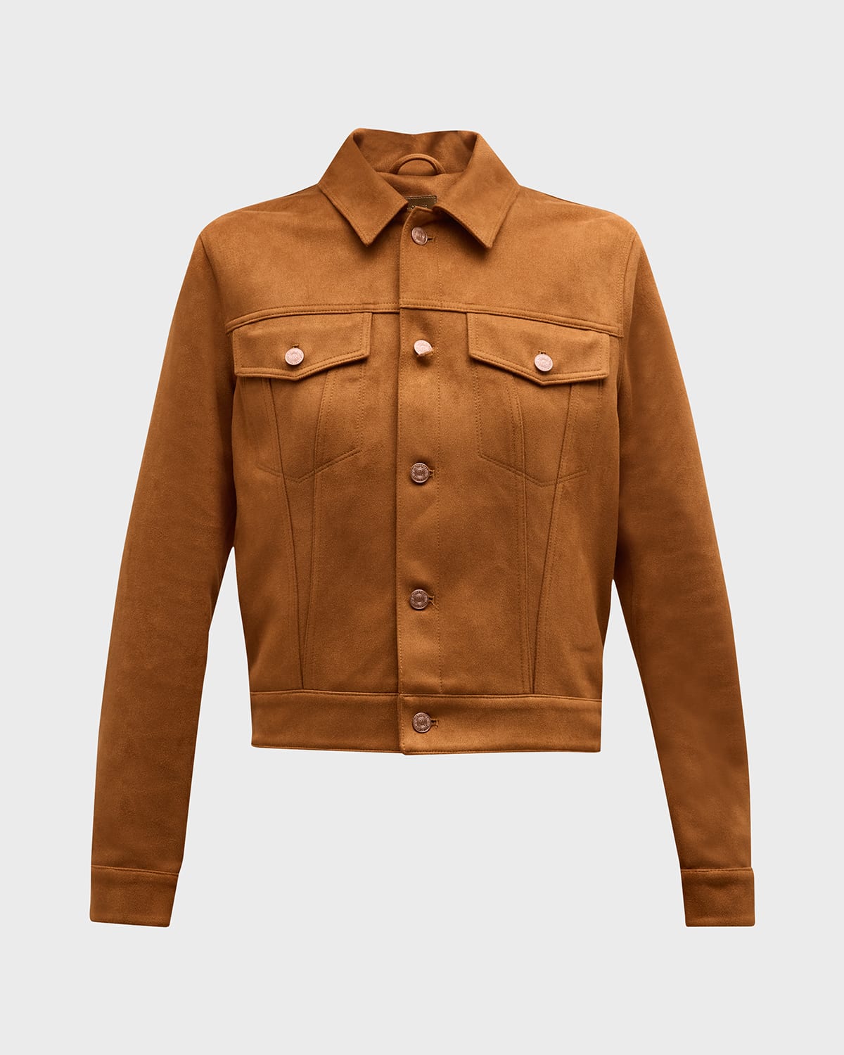 MOTHER "The Brusier" fauxsuede (polyester) trucker jacket featuring a buttonfront Point collar Long sleeves; button cuffs Flap pockets Slim fit Polyester/elastane Imported