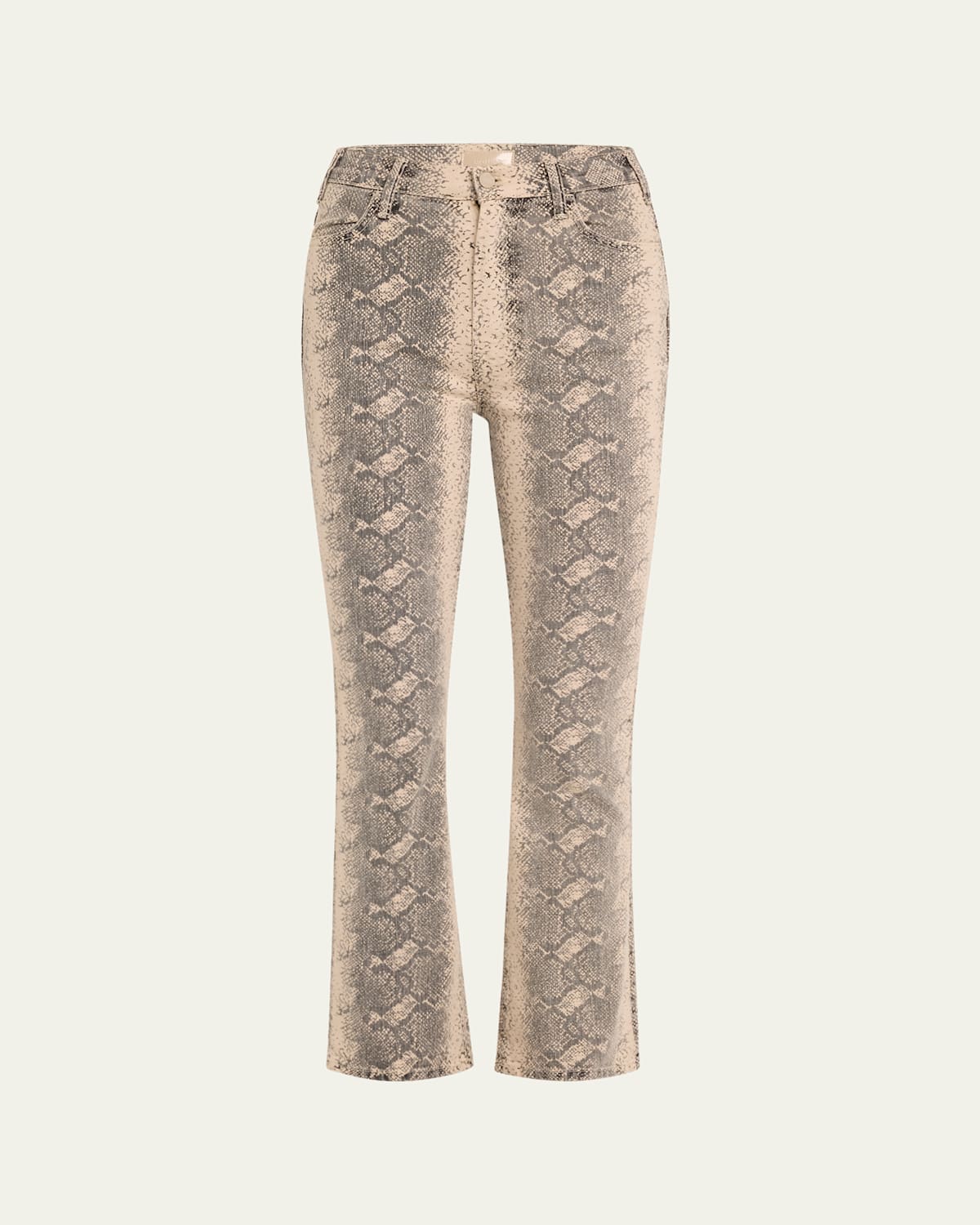 MOTHER "The Hustler Flood" jeans in snakeprinted denim Approx. 11" rise; 28.25" inseam High rise Fivepocket style Fitted through the hip and thigh Cropped length Button/zip fly; belt loops Cotton/elastane Made in USA