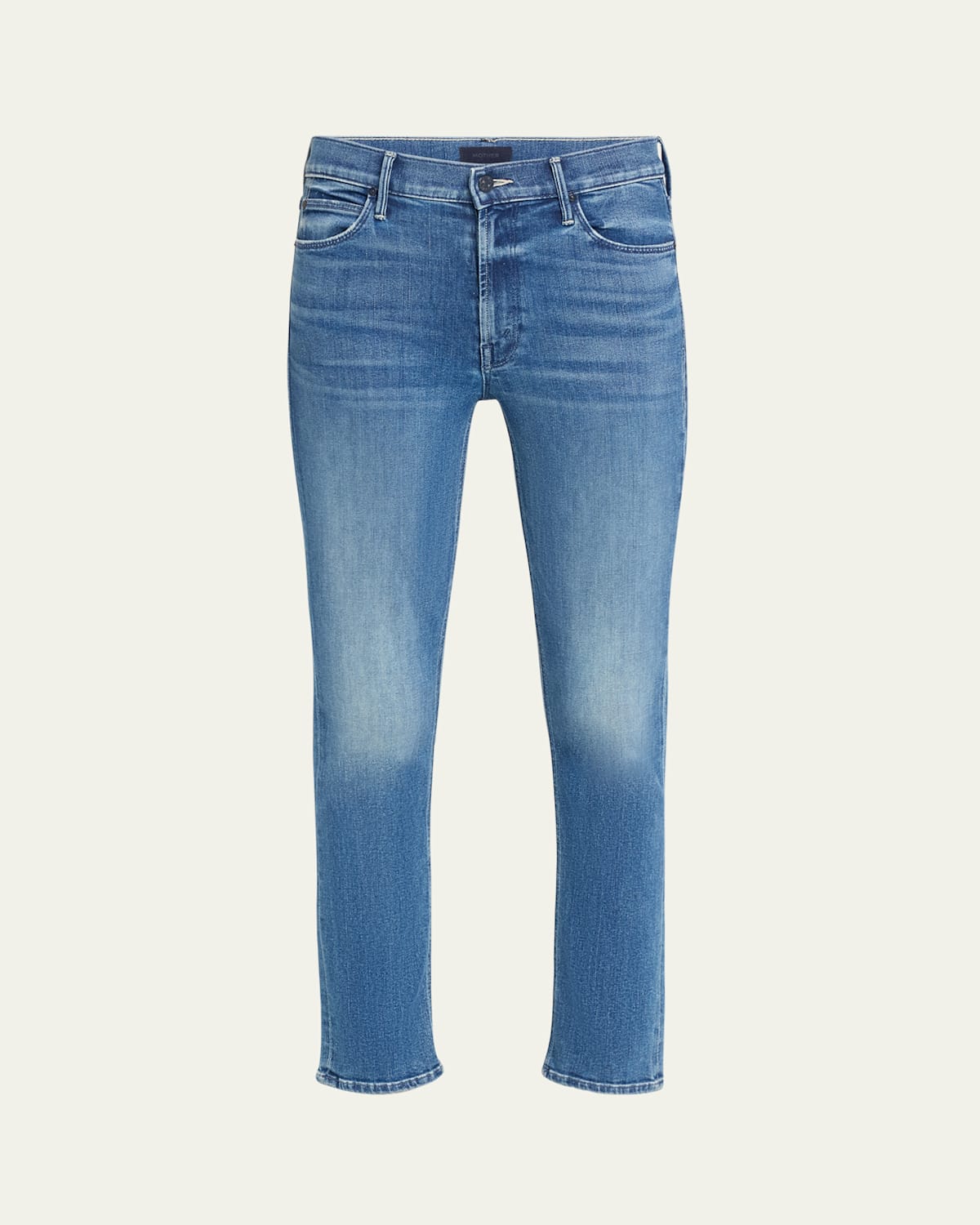 MOTHER "The MidRise Dazzler" jeans in medium wash denim. Approx. 9.8" rise; 27.5" inseam; 13 outseam Midrise; sits high on the hip Fivepocket style. Fitted through skinny legs. Cropped above ankles. Button/zip fly; belt loops. Cotton/lyocell/spandex. Made in USA of imported material.