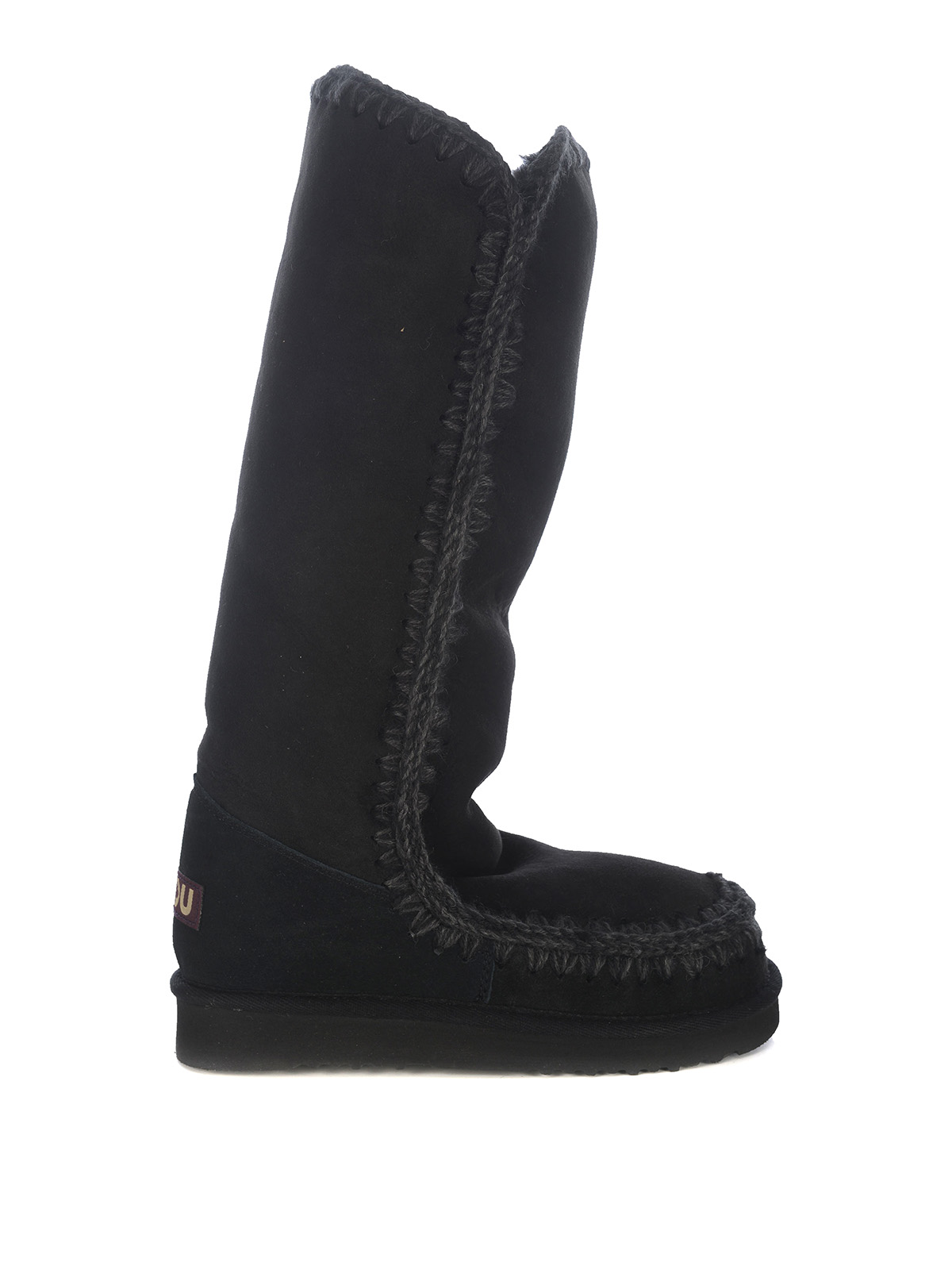 Bottes mou eskimo40 en daim noir et peau de mouton, bout rond, coutures en laine, écusson logo appliqué au dos, intérieur en peau de mouton, talon renforcé, semelle en caoutchouc.