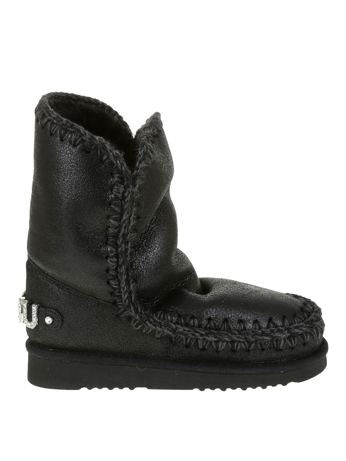 Bottines en peau de mouton noire, modèle court, surpiqûres extérieures, intérieur en peau de mouton, semelle en caoutchouc, insert logo avec strass au dos.