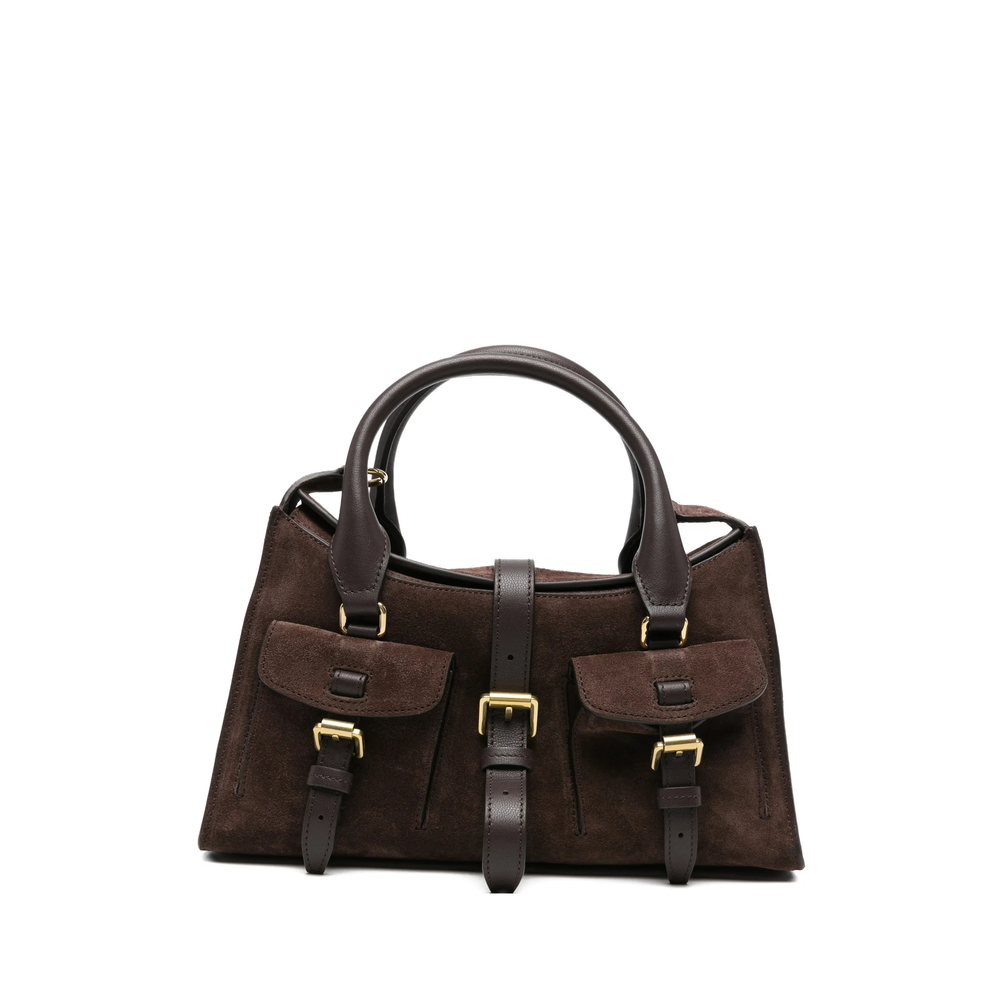 brown suede two rounded top handles adjustable shoulder strap two front flap pockets buckle-fastening straps gold-tone hardware This piece comes complete with a protective dust bag.