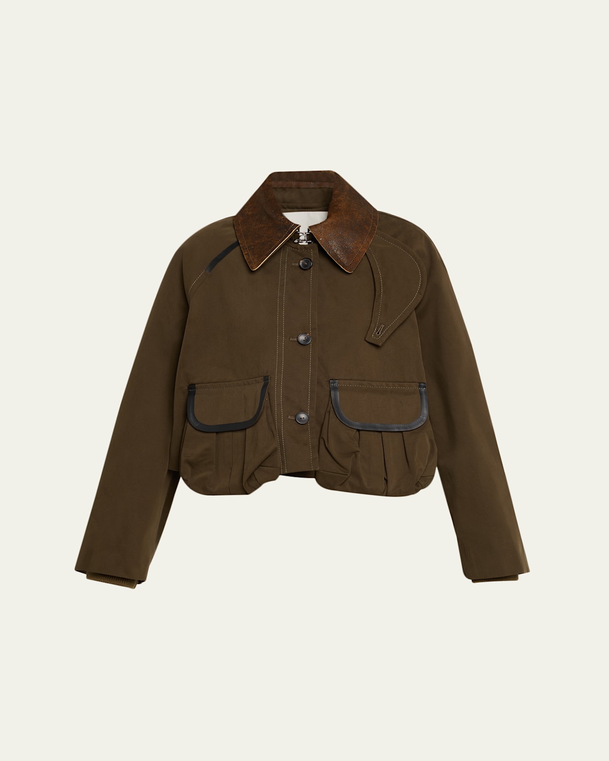 NACKIYE "Precious" cargo jacket featuring a leather collar and balloon pockets Point collar with throat latch; button concealed zip front Long sleeves Elbow patches Hip flap pockets Loose fit Hip length Cotton Imported