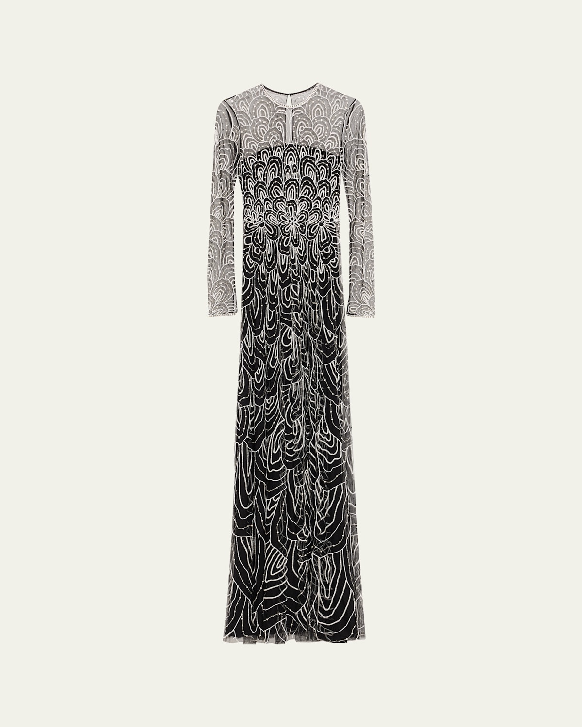 Naeem Khan illusion gown embellished with scalloped beading High neckline; strapless illusion Long sleeves; thumbholes Aline silhouette Floor sweeping hem Back zip Nylon/polyamide Made in USA