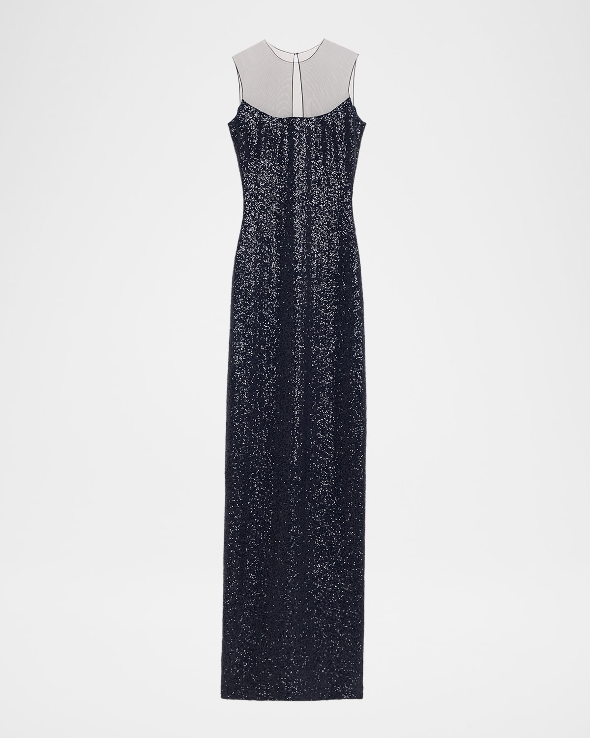 Naeem Khan gown embellished with allover sequins High neckline; strapless illusion Sleeveless Column silhouette Floor length Back slit hem Hook/keyhole back; invisible zip Nylon/polyamide/elastane Made in USA
