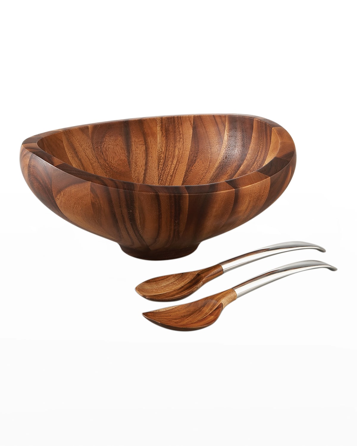 Designed by Sean O'Hara. Handcrafted salad set. Acacia wood and Nambe alloy. Bowl, 16"Dia. x 6.75"T; holds 4 quarts. Servers, 14"L. Hand wash. Imported.