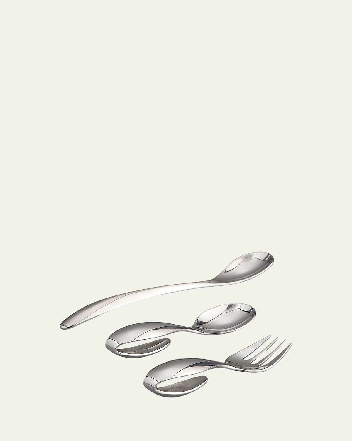 Nambé threepiece feeding set from the Baby Nambé collection. Includes loop spoon, loop fork, and feeding spoon. Arrives in exclusive gift box. Stainless steel. Dishwasher safe. Imported.