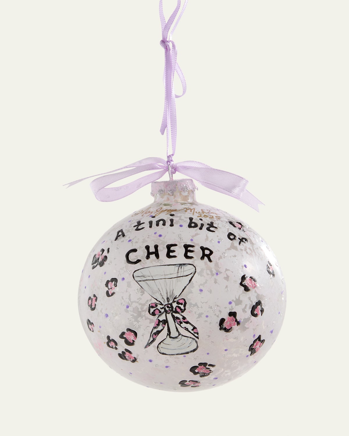 Designed and handpainted by NYC artist Nancy GeorgeMichalson, this Christmas ornament features the Bergdorf Goodman store on one side, and a martini glass with "A tini bit of cheer" text surrounded by pink leopard spots. Handcrafted of glass, acrylic paint, and glitter Finished with a satin bow and ribbon in polyester Signed and dated by the artist Approx. 4"Dia. x 4"T Handle with care Wipe clean Made in USA