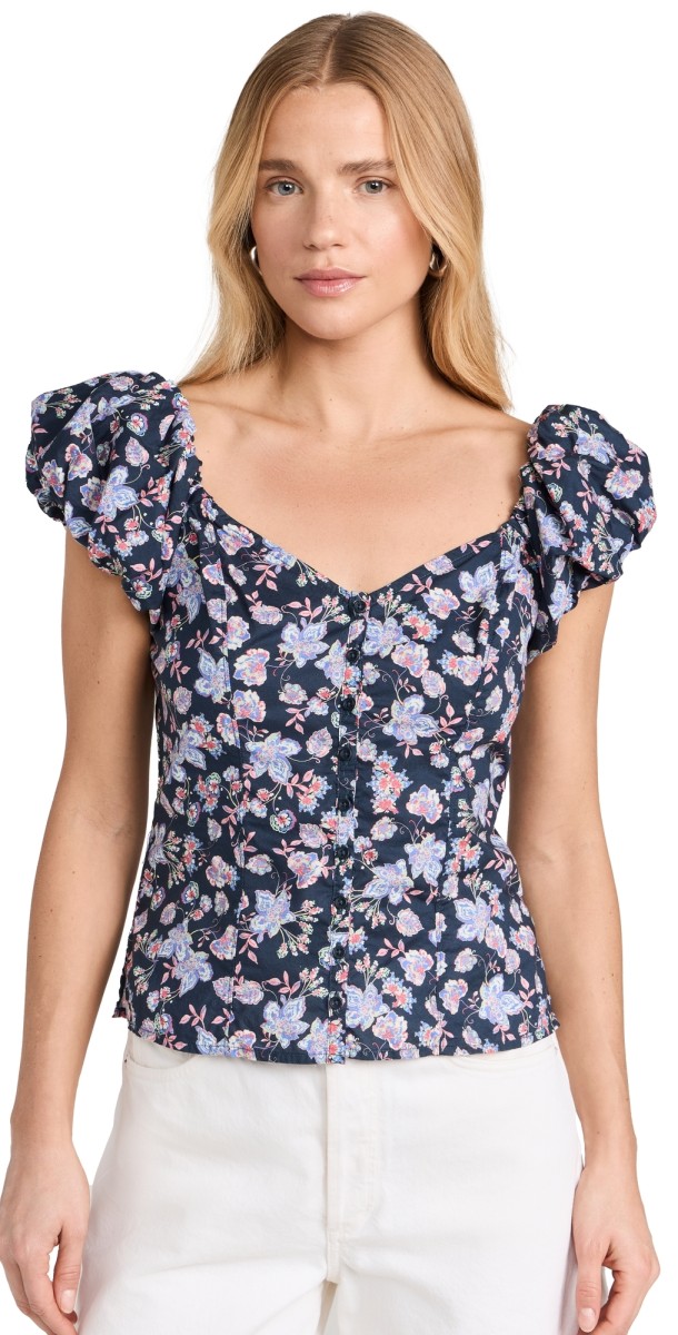 Fabric: Lightweight, non-stretch weave. V neckline with ruffle collar. Floral print. Short puff sleeves with elastic cuffs. Button placket. Shell: 100% pima cotton. Wash cold. Imported, Peru. Measurements: Measurements from size XS Length: 19in / 48.0cm, from shoulder