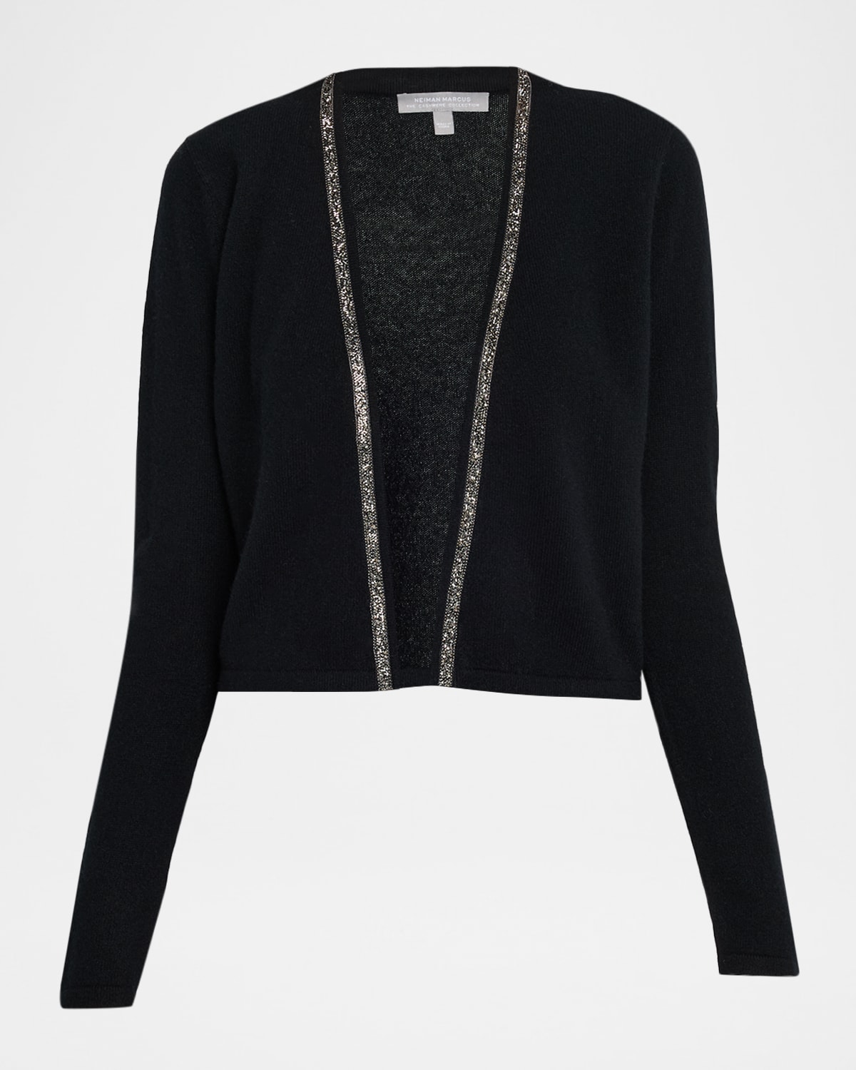 This Neiman Marcus Cashmere Collection shrug is finely knit in cashmere and decorated with beaded trim Approx. 19"L from shoulders to hem 9GG, 2ply Open front Long sleeves; approx. 29.5"L Hip length Relaxed fit Cashmere Dry clean Trim: Beads Imported