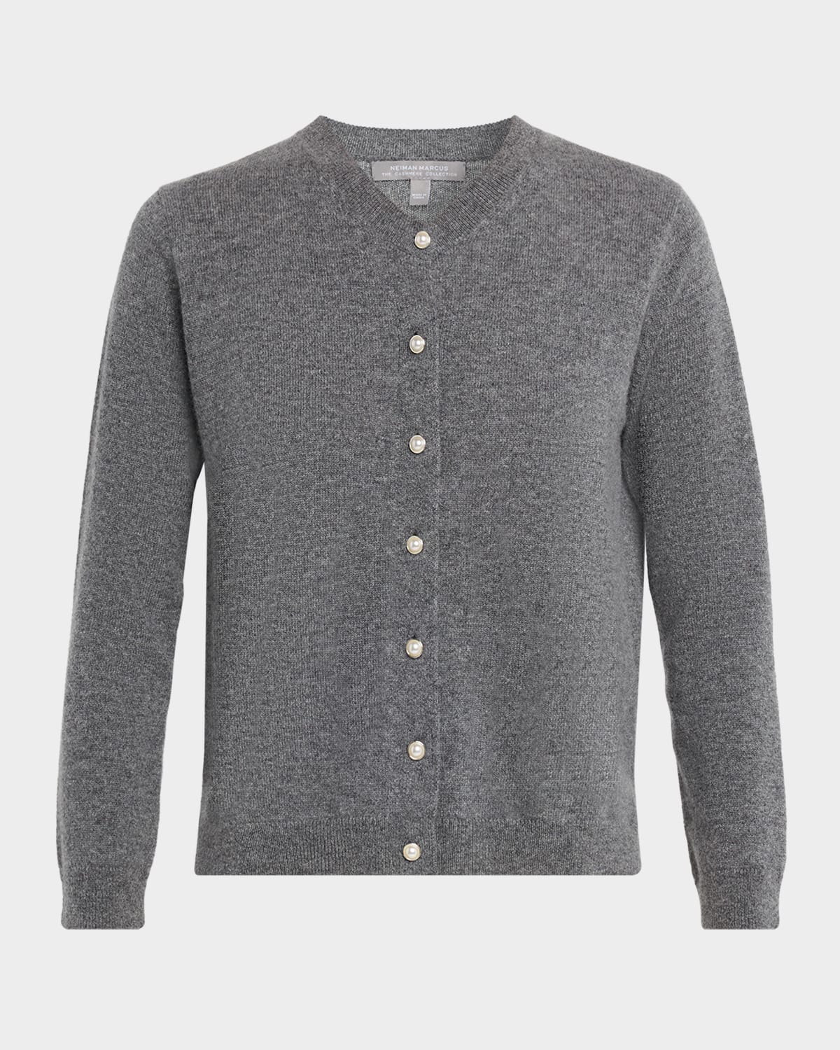 This Neiman Marcus Cashmere Collection cardigan is knit in fine cashmere with pearlescent beads for a luxurious touch of shine Approx. 21"L from shoulders to hem 9GG, 2ply Crew neckline Button front closure 3/4 sleeves; approx. 26.5"L Hem side slits Relaxed fit Cashmere/faux pearls Dry clean Imported