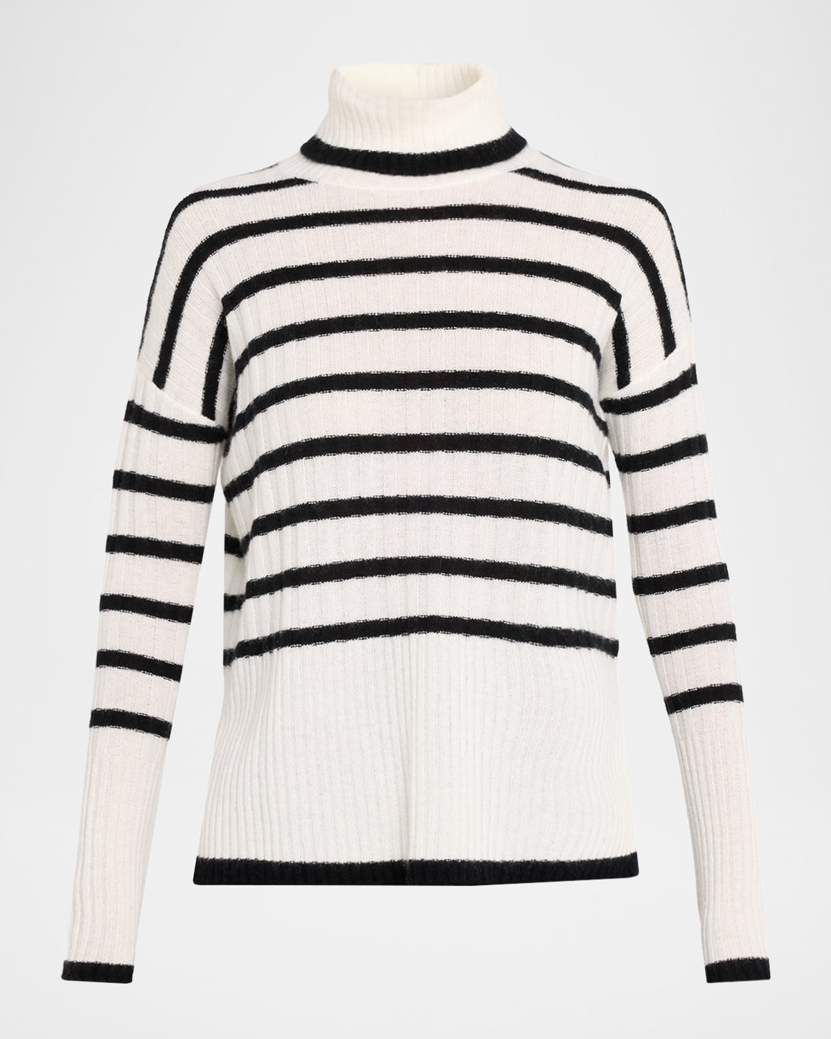 Neiman Marcus Cashmere Collection sweater features vertical ribbing contrasted with bold horizontal stripes Approx. 24"L from shoulders to hem 7GG, 2ply Turtleneck Drop shoulders Long sleeves; approx. 29.5"L Hem side slits Relaxed fit Pullover style Cashmere Dry clean Imported