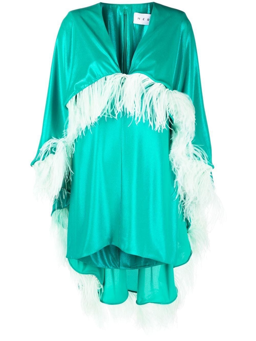 emerald green feather-trim detailing high-shine detailing V-neck empire line long sleeves asymmetric hem above-knee length