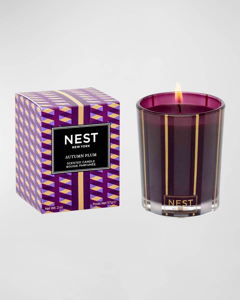 Elevate everyday living with this exquisitely fragranced autumn candle. It is meticulously crafted with a proprietary premium wax formulated so the plum candle burns cleanly and evenly and infuses the atmosphere with exceptional scent. Purpletinted wax housed in a glass vessel of the same color with elegant gold and frosted stripes Fragrance Notes: Wild plum, cinnamon, patchouli leaf, and cashmere wood Mood: Mellow Approximate burn time: 2028 hours 2.0 oz. / 70 g