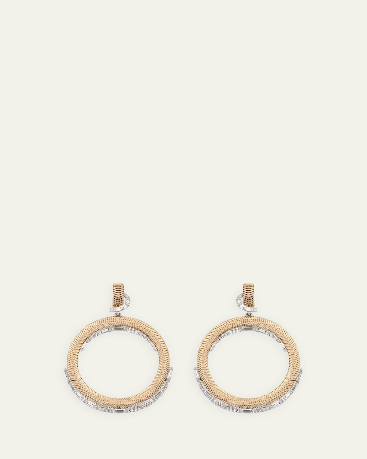 Nikos Koulis hoopdrop earrings. From the Feelings Collection. 18karat yellow gold hardware. Hoops with baguette diamonds. 3.50 total diamond carat weight. Post backs for pierced ears.