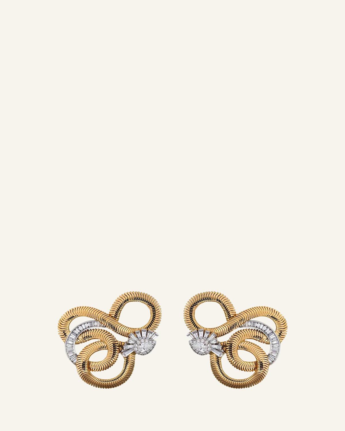 Nikos Koulis swirling chain earrings from the Feelings collection are made with mixedcut white diamonds Polished 18karat yellow gold Diamonds set in 18karat white gold 0.25 round diamond carat weight 0.51 pear diamond carat weight 1.68 tapered baguette diamond carat weight For pierced ears Made in Greece
