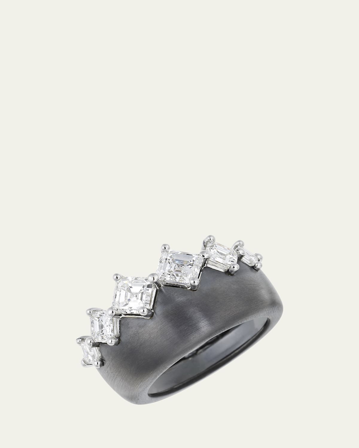 The brushed band and asschercut diamonds of this ring are carefully aligned through Greek craftsmanship. As part of the ME collection, this Nikos Koulis ring channels a balance between precious metal and stones. 18karat blackened white gold Six asschercut white diamonds 2.29 total diamond carat weight Made in Greece