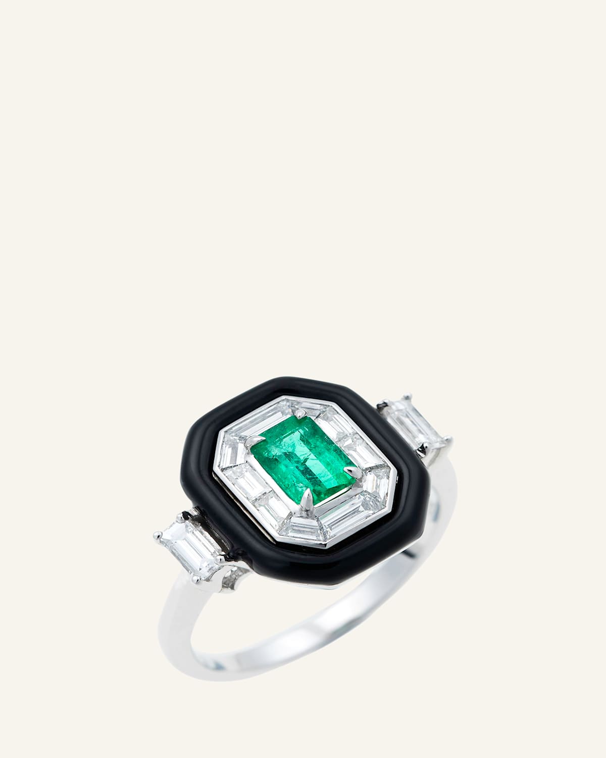 Nikos Koulis ring from the Oui Collection. 18karat white gold with black enamel. Green emerald with diamond baguettes. 0.75 total diamond carat weight. 0.58 total emerald carat weight.