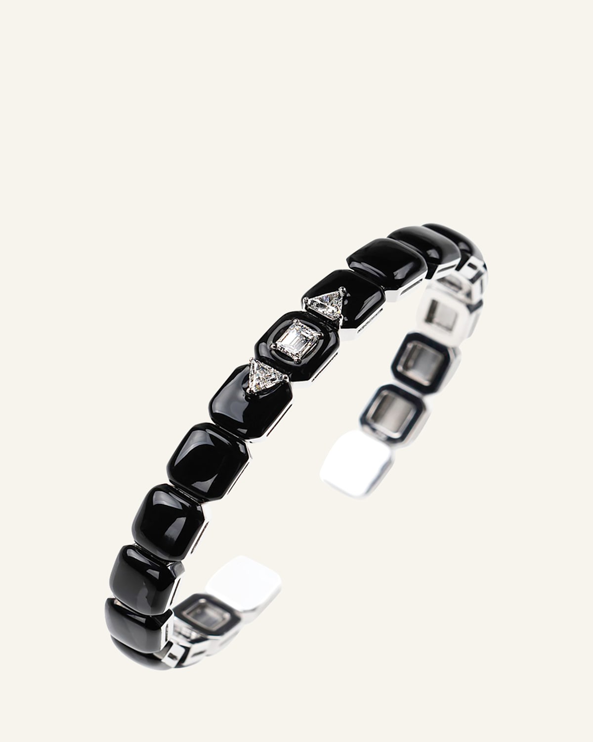 Nikos Koulis bracelet from the Oui Collection. Polished 18karat white gold with black enamel. Emeraldcut and trillioncut white diamonds. 0.24 total center diamond carat weight. 0.28 total trillion diamond carat weight. Split opening eases dress.