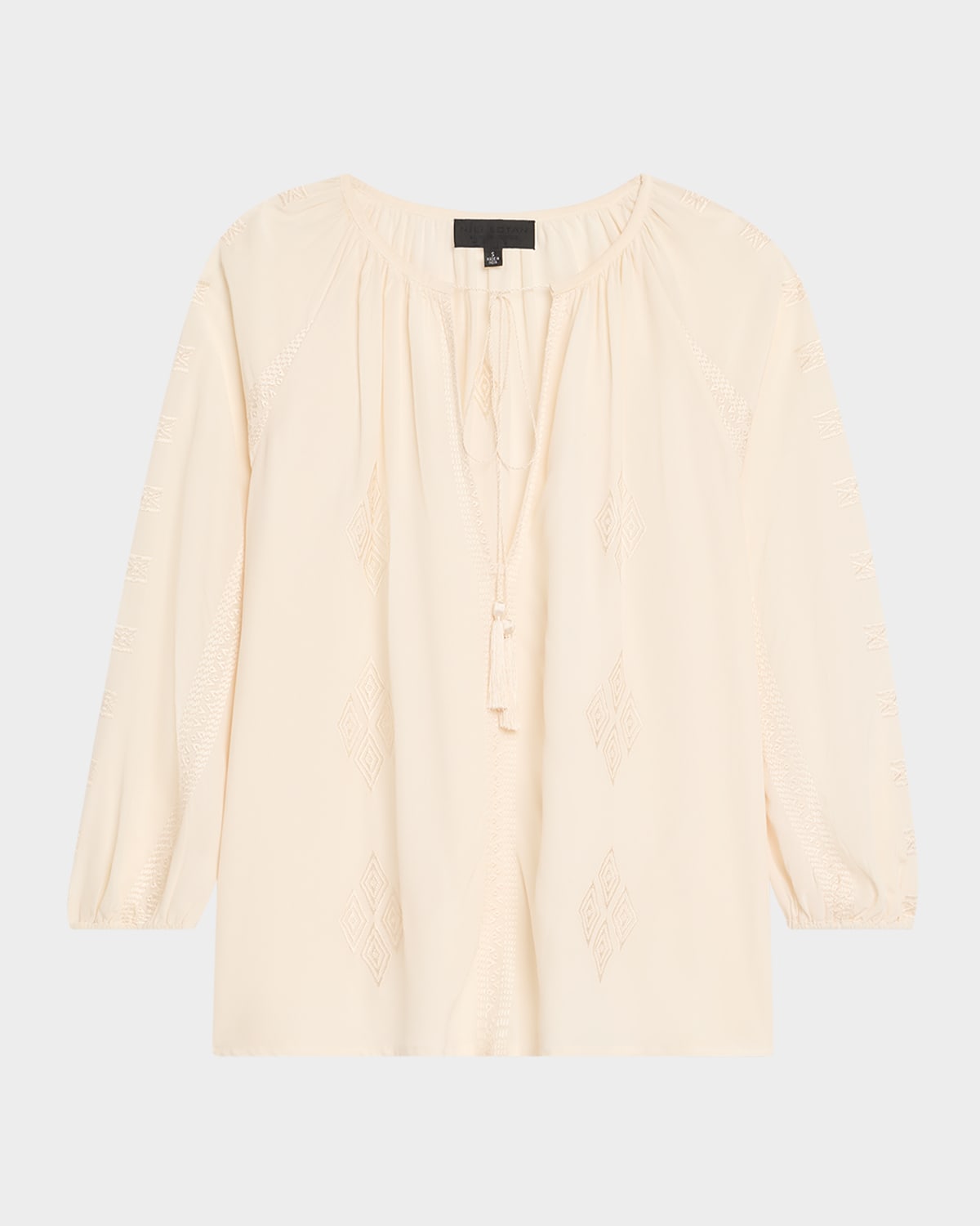 Nili Lotan "Cristo" embroidered silk blouse V neckline with tassel ties Threequarter raglan sleeves Loose fit Hem falls to the hip Pullover style Silk Made in USA from imported materials