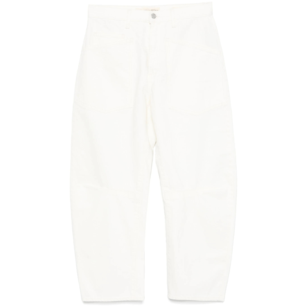 white front button and zip fastening belt loops classic five pockets tapered leg