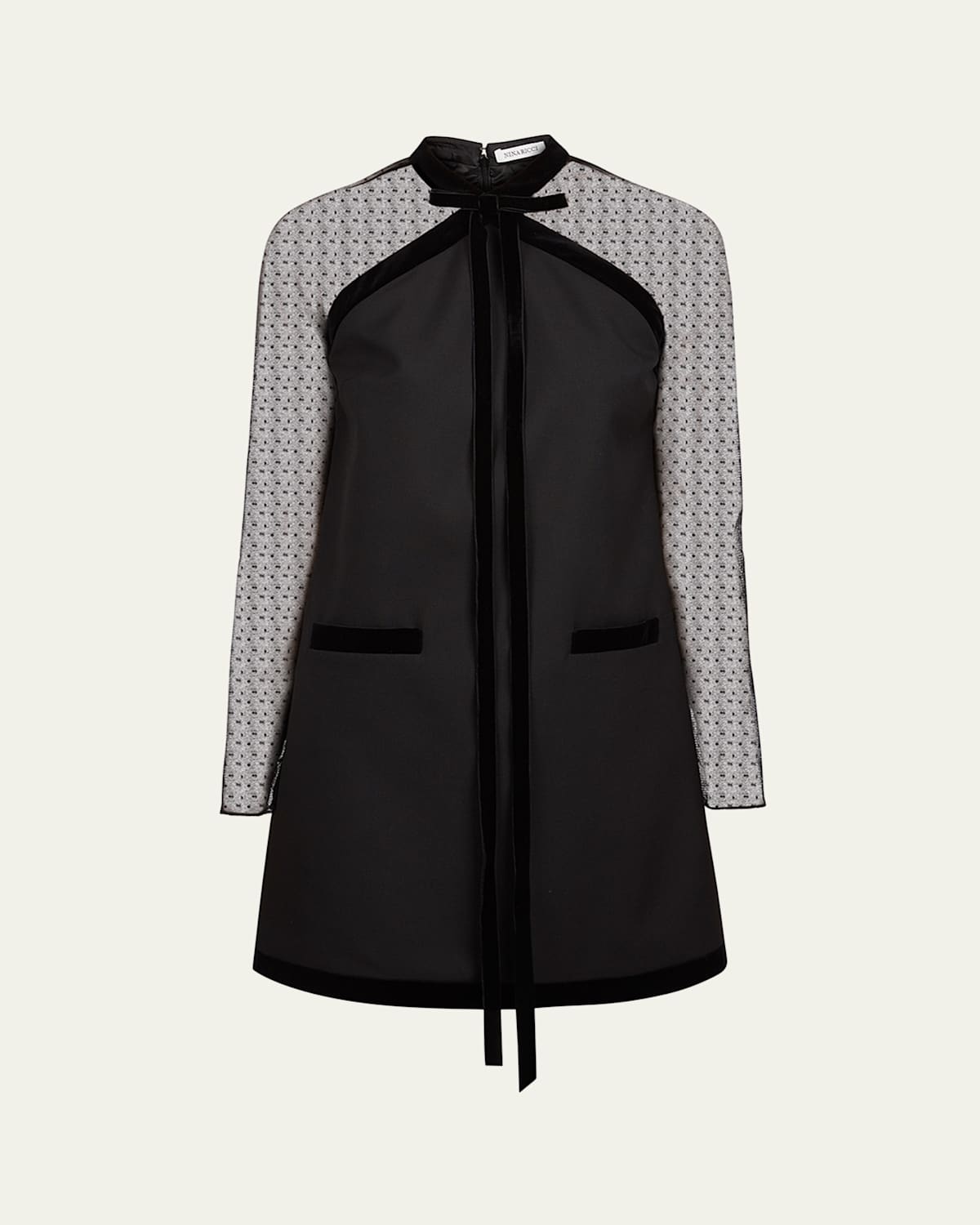 Nina Ricci dress featuring swiss dot mesh sleeves and a velvet bow neck detail High neckline; halter illusion Long sleeves Hip welt pockets Shift silhouette Mini length Back zip Virgin wool/cotton Lining: Viscose Made in Poland