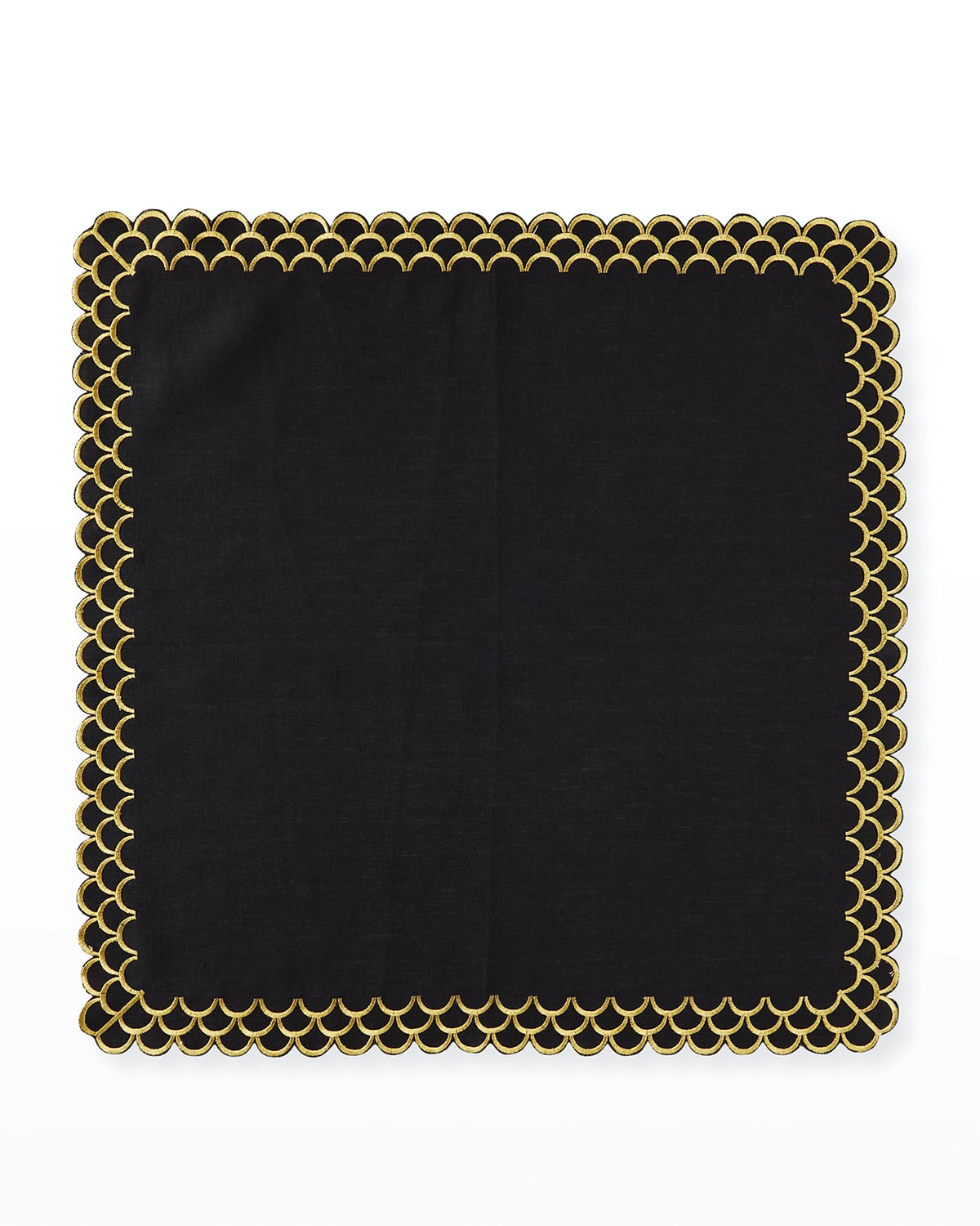Napkin features embroidered scalloped edges Made of linen Machine wash cold, tumble dry low Iron on reverse if needed Imported