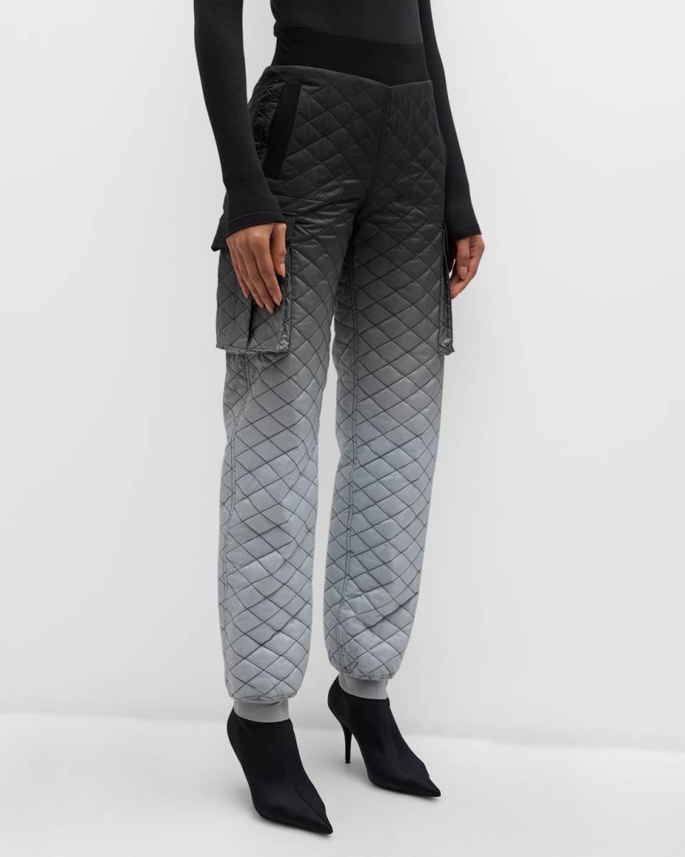 Norma Kamali joggers in a quilted ombré construction Highrise waistband Side seam and functional cargo pockets Relaxed fit Tapered legs Banded cuffs Pullon style Polyester Hand wash Made in USA from imported materials