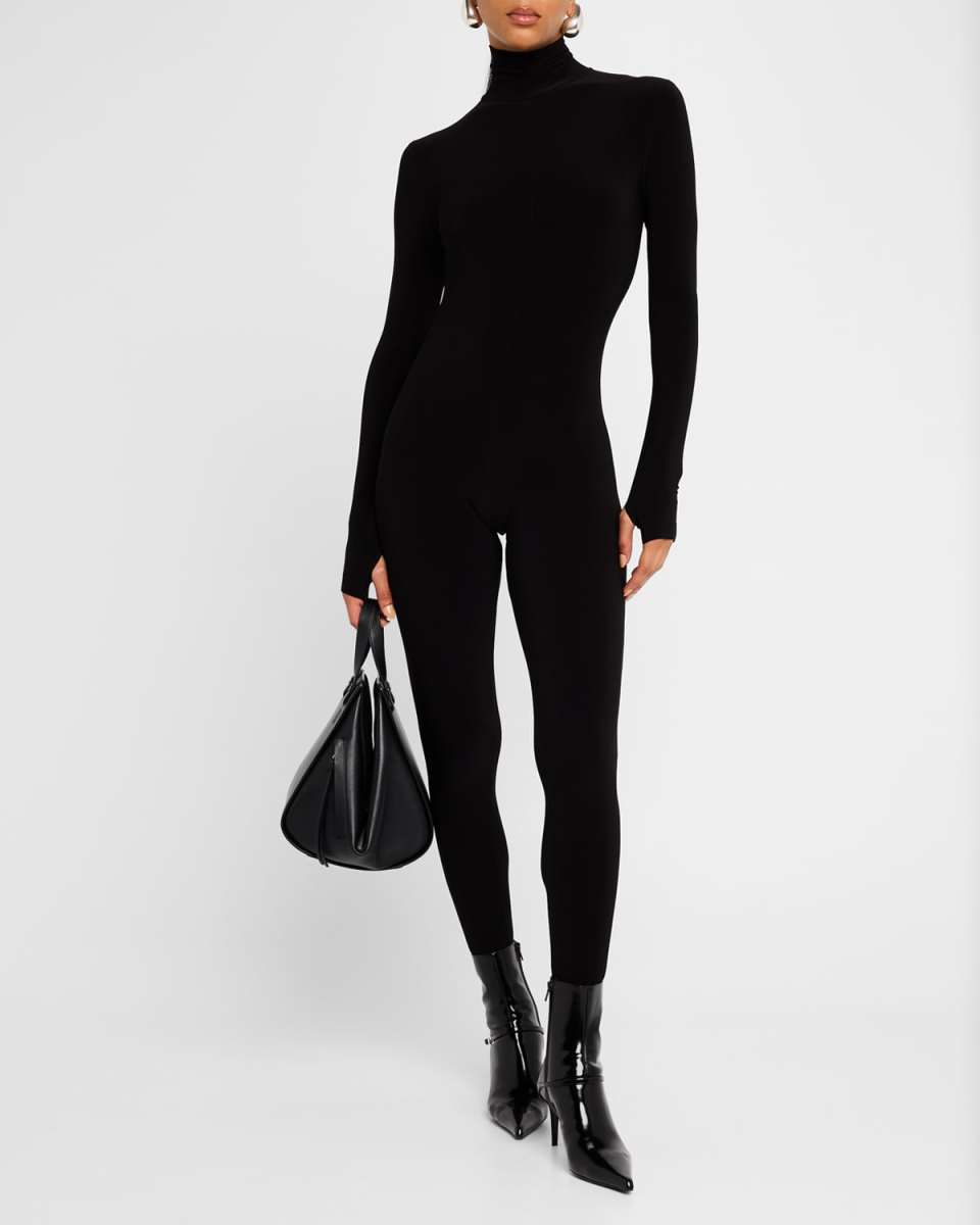 Norma Kamali catsuit crafted from a fourway stretch poly lycra fabrication Turtleneck Long sleeves with thumbholes Slim fit Stirrup foot Invisible zip closure Polyester/spandex Hand wash Imported