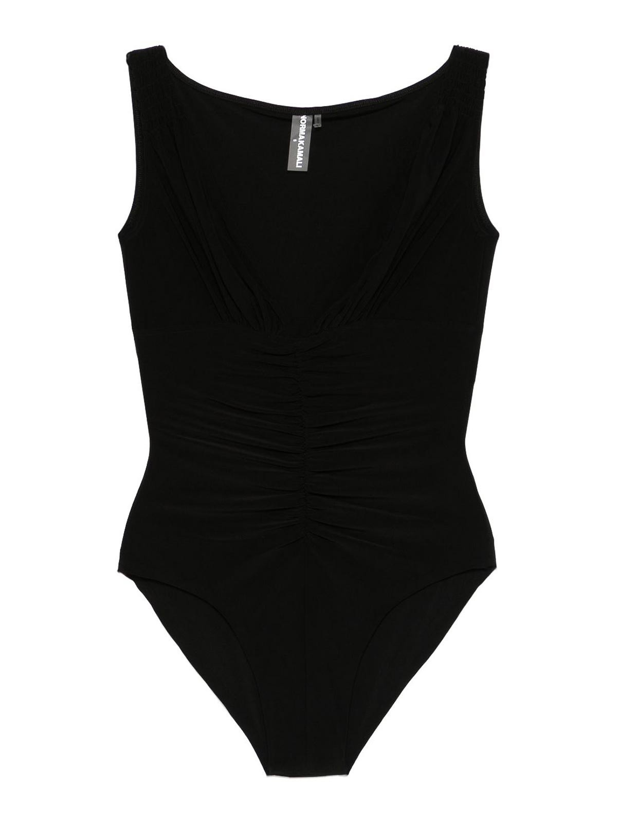 Encolure en V noire à empiècement froncé et sans manches pour vous rappeler que cette pièce doit être essayée par-dessus vos propres vêtements.