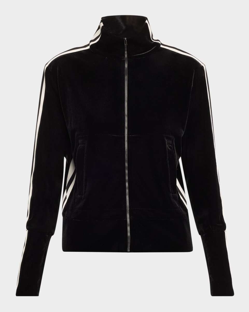 Norma Kamali velvet jacket with side striping Turtleneck Long sleeves Sideentry pockets Hip length Slim fit Full front zip Polyester/spandex Imported