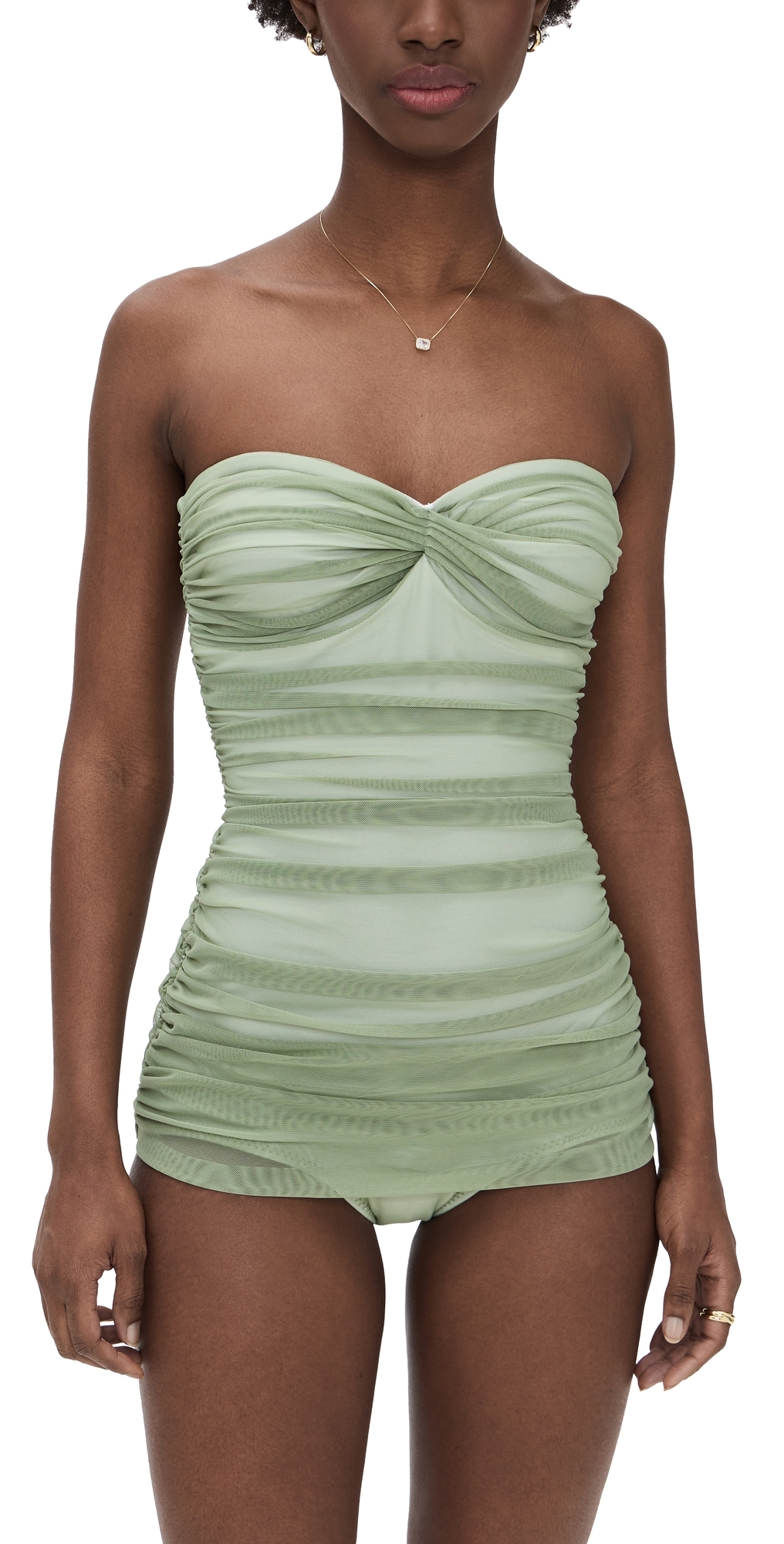 Ruched mesh overlay. Non-slip rubber binding at top hem. Boned side seams. Full coverage. Strapless. Shell: 82% nylon/18% spandex. Lined. Lining: 95% polyester/5% spandex. Wash cold. Imported, China.
