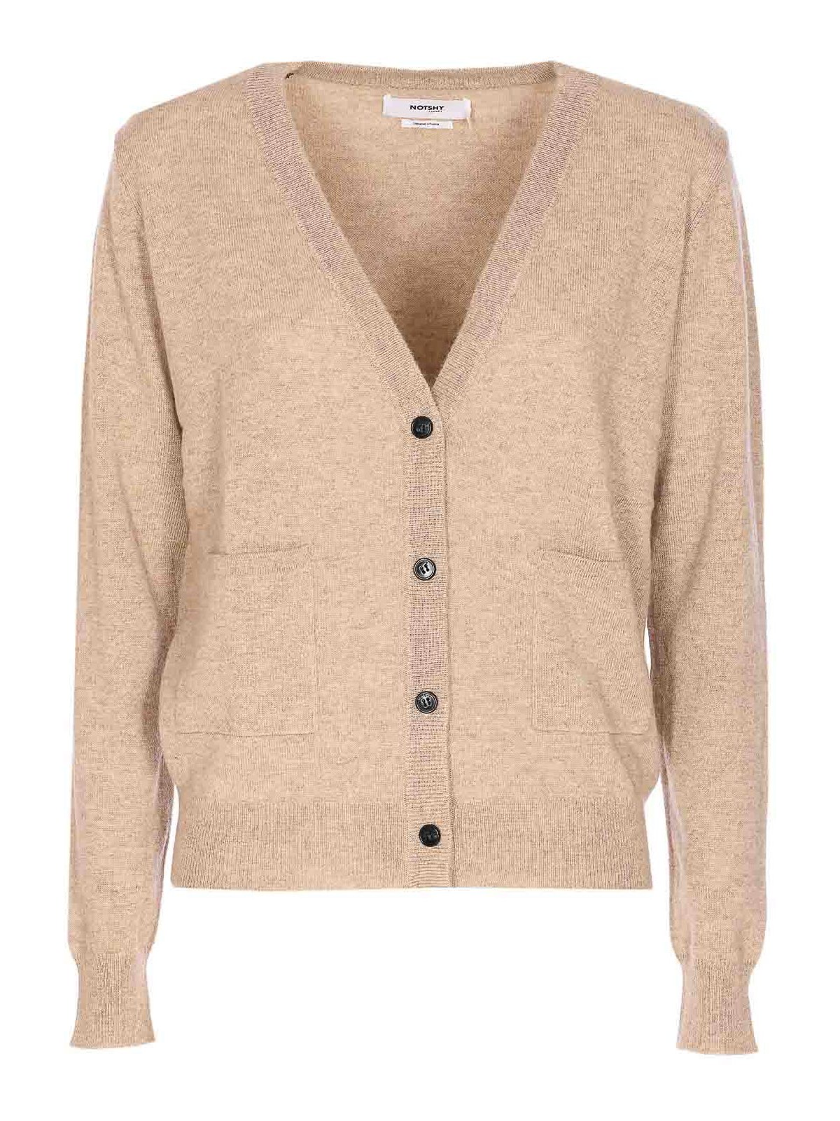 Cardigan Ava beige Not Shy avec boutons frontaux, manches longues et poches