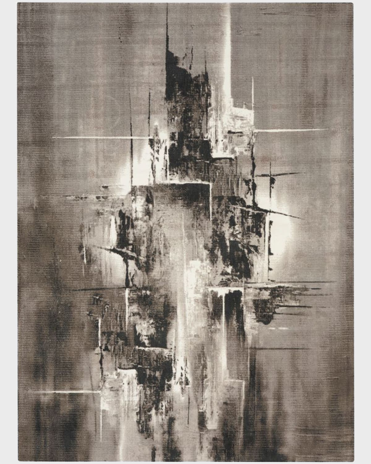 Create a dramatic focal point in your living room or bedroom with this abstract rug. A sharp, sophisticated pattern in tones of black, grey, and ivory gives neutral decor a chic feel. This modern rug is handfinished with a cut pile that has a comfortably soft texture. Handcrafted of Luxcelle™ fiber and wool Rug height: 0.5" Serged edges Item Weight (Lbs.): 28.0 Vacuum regularly; professional clean only Size is approximate; we recommend use of a rug pad (not included) Imported
