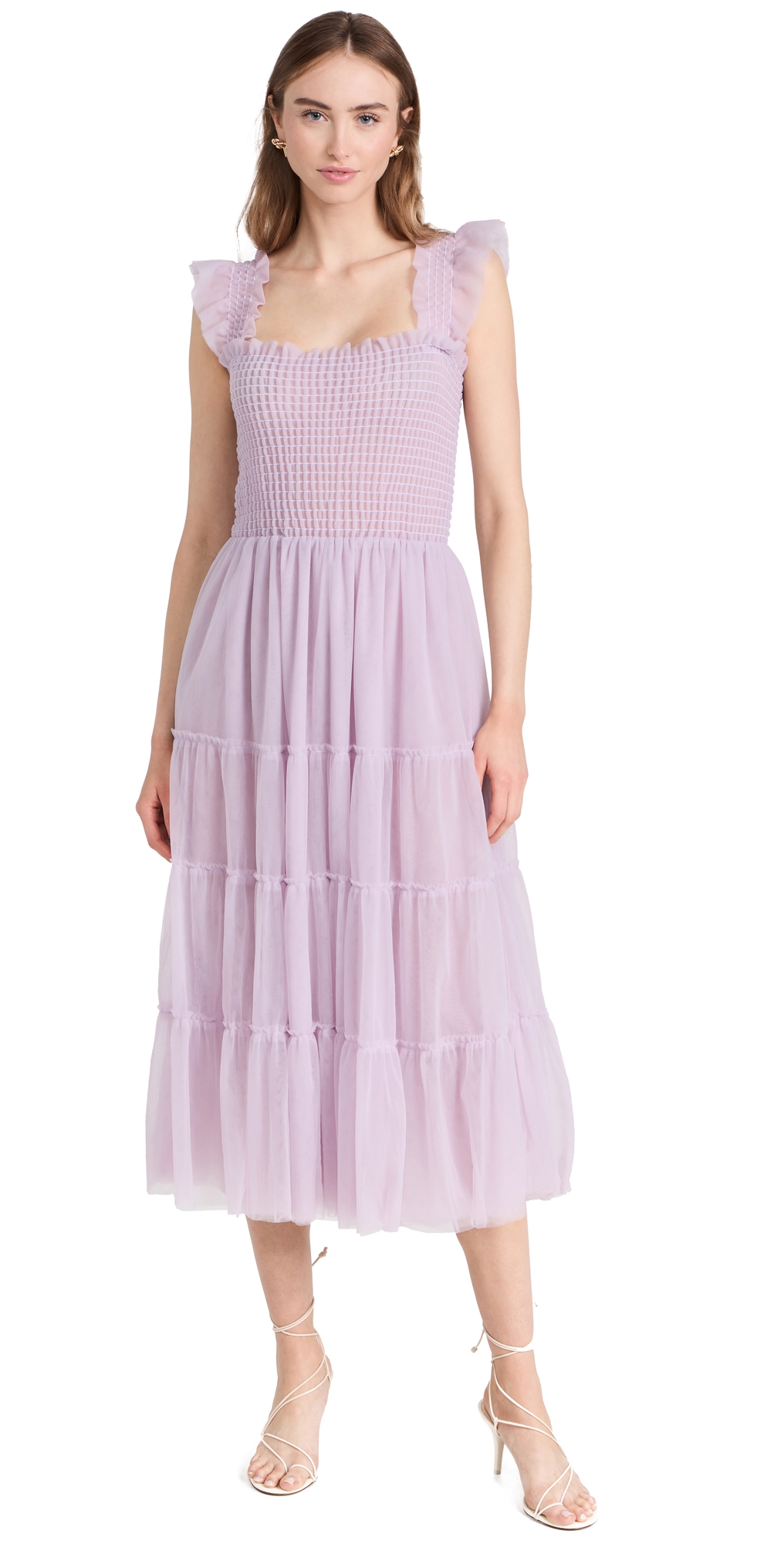 Fabric: Lightweight mesh. Smocked elastic bodice. Tiered skirt and ruffle trim. Square neck and flutter sleeves. On-seam side pockets. Shell: 100% polyester. Unlined. Hand wash. Imported, China. Measurements: Measurements from size S Length: 48.5in / 123.0cm, from shoulder