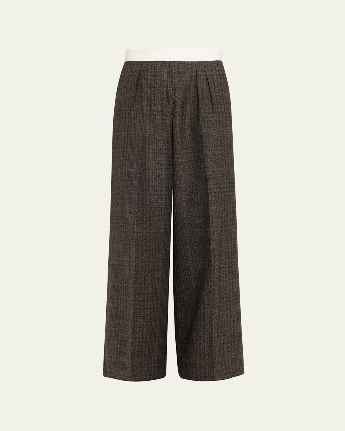 Crafted in signature Italian virgin wool, the "Elia" plaid trousers by Officine Generale feature a contrast waistband for a refined silhouette with a loose fit. High rise Fourpocket style Wide legs Full length Button/zip fly; belt loops Wool Dry clean only Imported