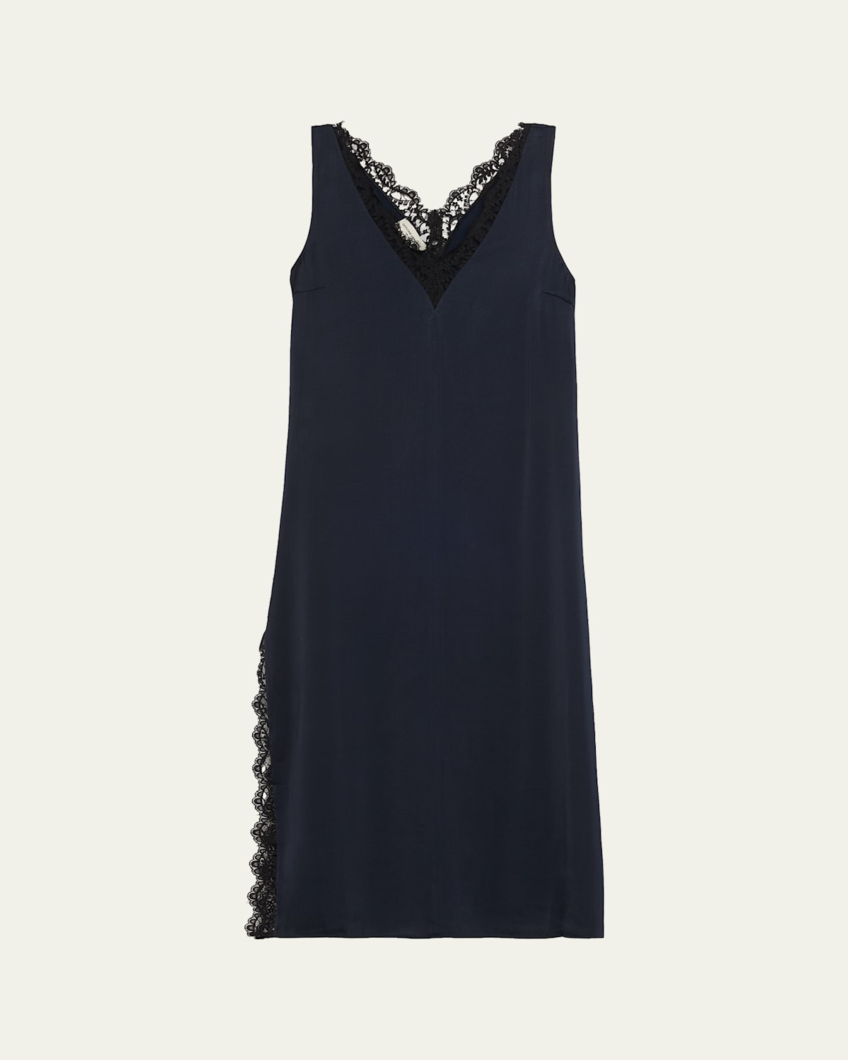 Crafted in flowing viscose, the "Lia" dress by Officine Generale boasts contrasting French lace trim for a feminine touch. V neckline Sleeveless Slip silhouette Hem falls below the knee Slipover style Viscose Dry clean only Made in Portugal