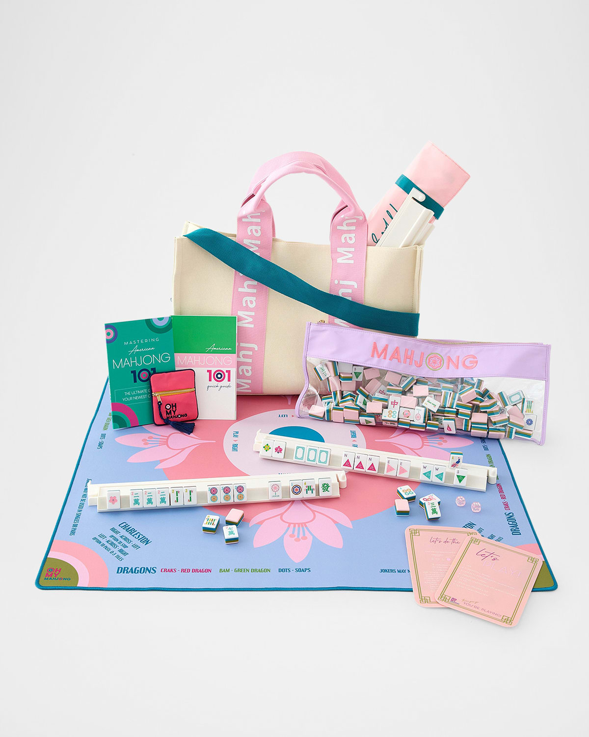 Ooh La La! Step into a world of opulence and elevate your mahjong experience with the La Fete Ultimate Starter Kit. This luxurious kit features handpainted La Fete Tiles, each one a whisper of sophistication and charm, accompanied by a matching tile storage bag that radiates elegance. The white racks and pushers reveal the timeless beauty and refinement of this reimagined game, while the nonslip neoprene mat promises hours of comfortable and stylish gameplay. Every detail of this allinone set ha